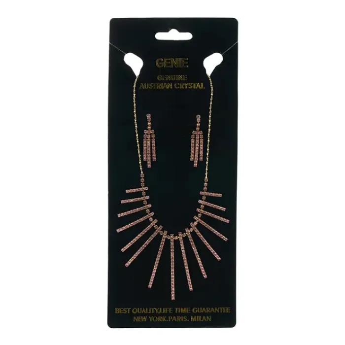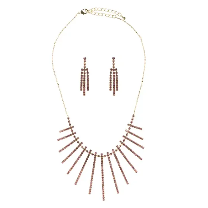 Бижутерный комплект из колье и серег с розовыми стразами и покрытием под золото.
