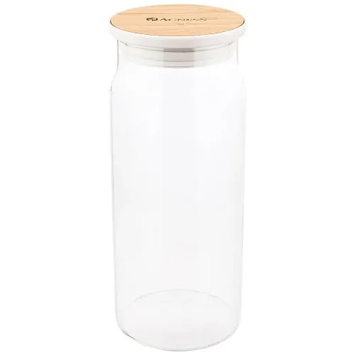 Корпус емкости изготовлен из жаропрочного стекла, что обеспечивает прочность и гигиеничность. Прозрачные стенки позволяют визуально контролировать количество содержимого. Конструкция включает бамбуковую крышку, которая предотвращает просыпание и способствует сохранности продуктов.