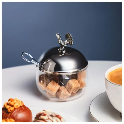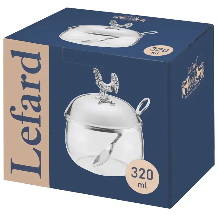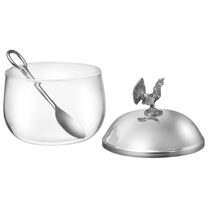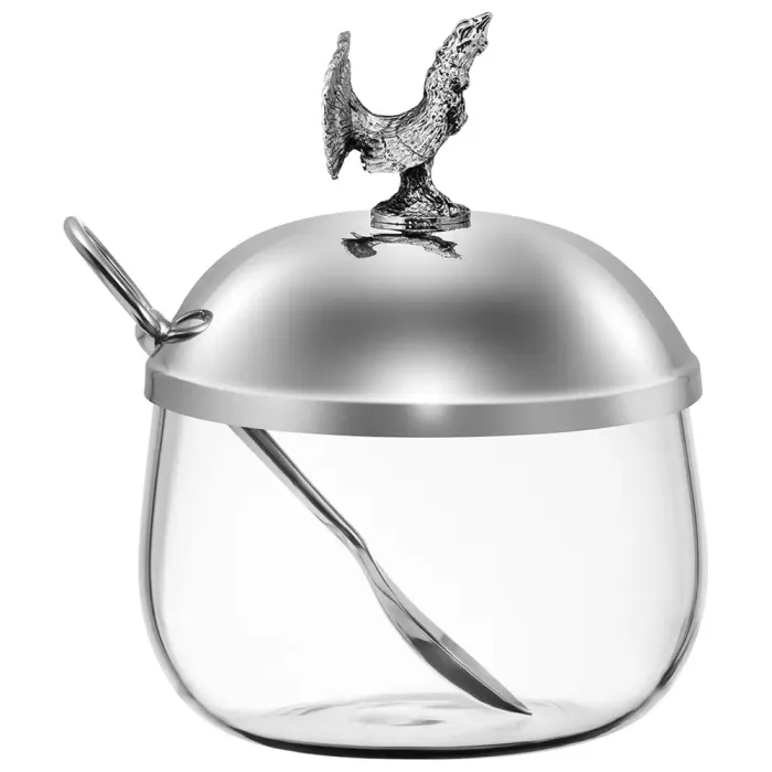 Корпус емкости выполнен из стекла, крышка — из нержавеющей стали марки 304 с полировкой. Хромированная подставка обеспечивает устойчивость на поверхности. Металлические ручки в виде птиц служат декоративным элементом, а ложка в комплекте дополняет функциональность набора.