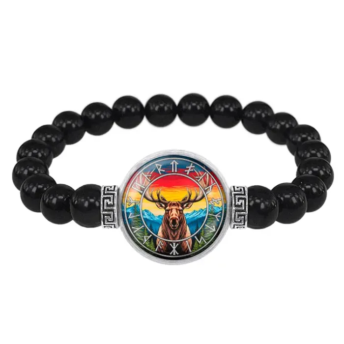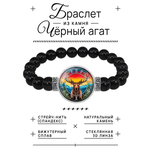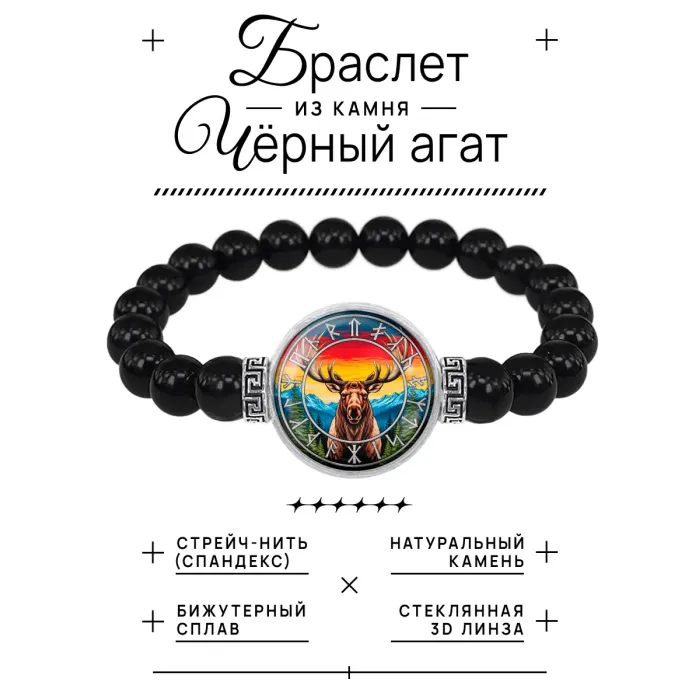 Браслет из чёрного агата с изображением символа Темный Сох (Лось) под выпуклой стеклянной линзой.