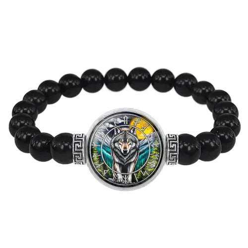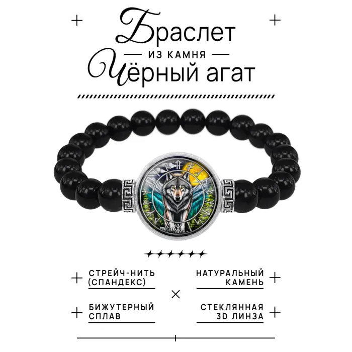 Браслет из чёрного агата с изображением тотема «Притаившийся Лют» (Волк) по мотивам славянского тотемного годослова.