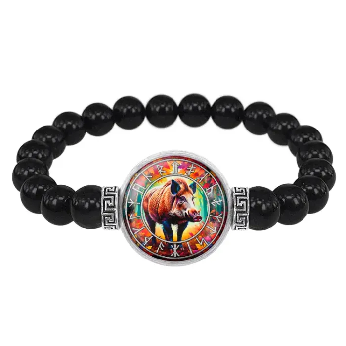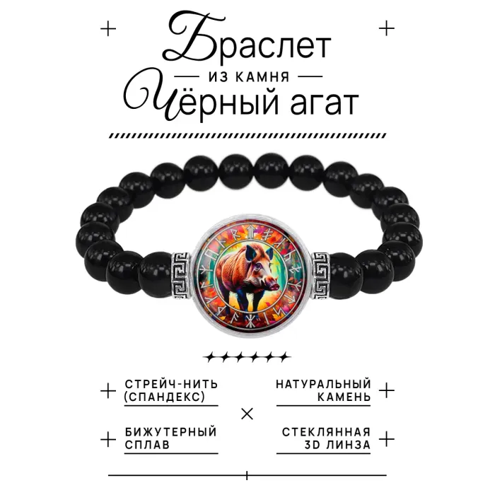 Браслет из чёрного агата с изображением тотема Дикий Вепрь по славянскому годослову.