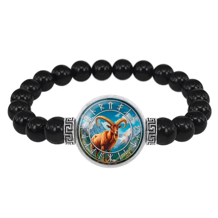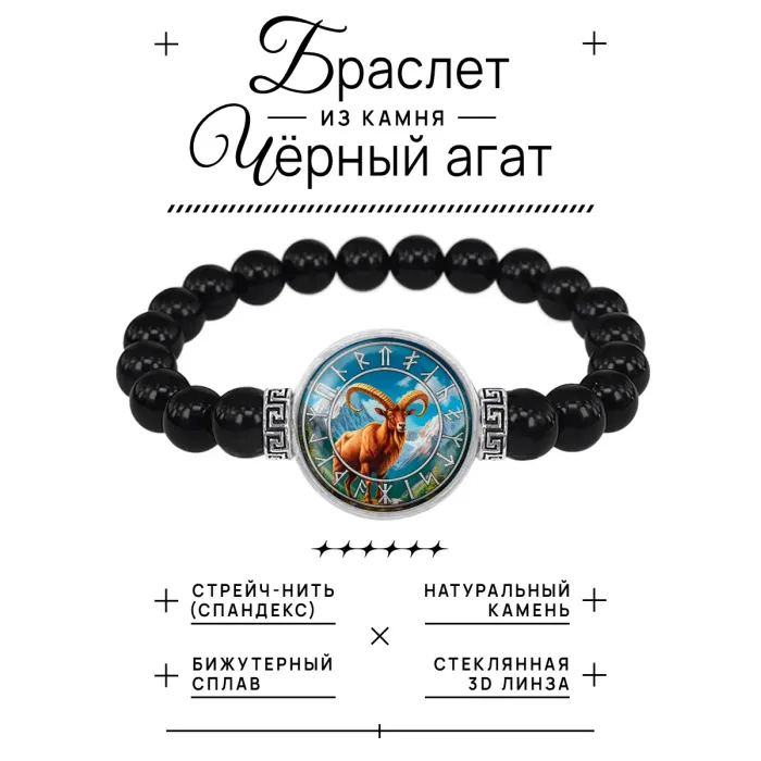 Браслет из чёрного агата с изображением символа Златорогий Тур под выпуклой стеклянной линзой.