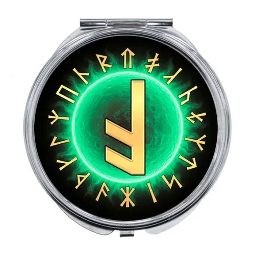 Складное зеркало для личного использования, изготовленное из металла и стекла, с нанесённым изображением славянской руны.