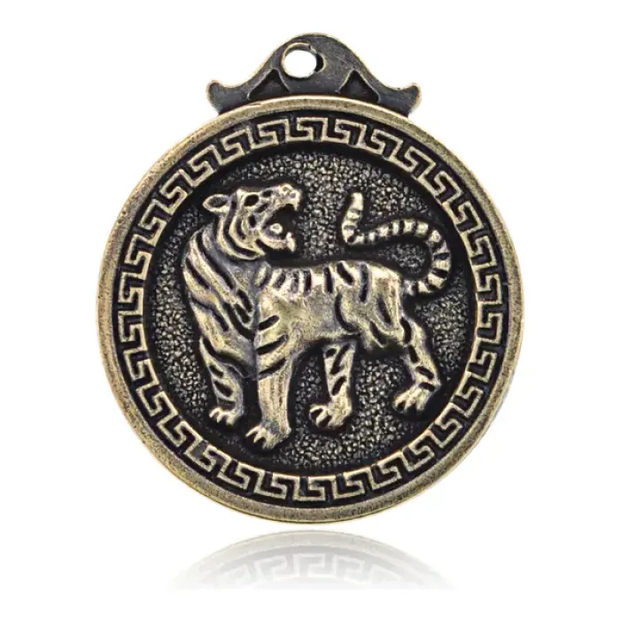 Подвеска для кулона или брелка с изображением тигра по мотивам восточного гороскопа. Изготовлена из бронзы, диаметр 3 см.