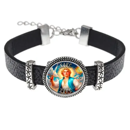 Кожаный браслет с изображением славянского бога Хорса. Изображение защищено выпуклой стеклянной линзой, размер регулируется.