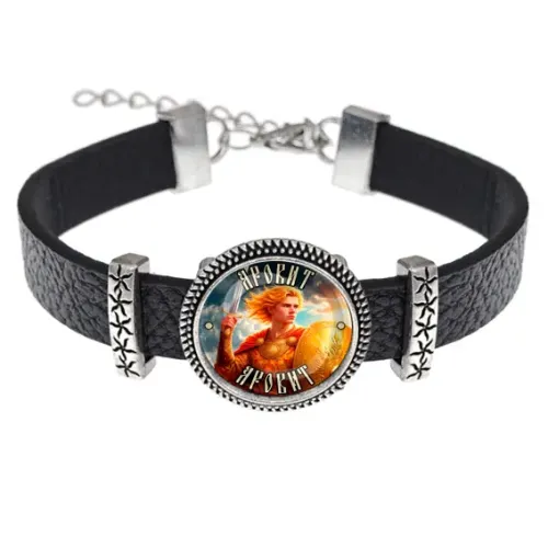 Кожаный браслет с изображением Яровита под выпуклой стеклянной линзой.