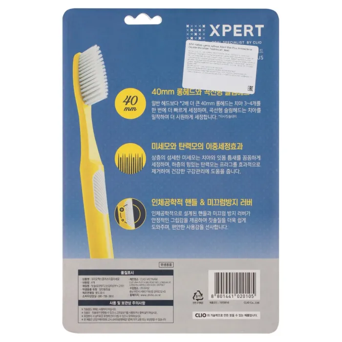 Набор зубных щеток Xpert Max Plus Antibacterial Double Microfiber Toothbrush от бренда Clio обеспечивает высокоэффективную гигиену полости рта. Щетки оснащены удлиненной головкой длиной 40 мм, что позволяет одновременно очищать 3-4 зуба. Ультратонкие и упругие щетинки тщательно очищают промежутки между зубами и деснами, обеспечивая эффект двойной очистки. Прочные щетинки эффективно удаляют зубной налет, а наличие ионов серебра в составе подавляет рост бактерий на 99,9%.