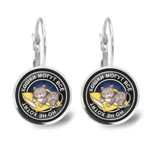 Серьги с изображениями кошек под выпуклыми стеклянными линзами, замок типа левербэк.