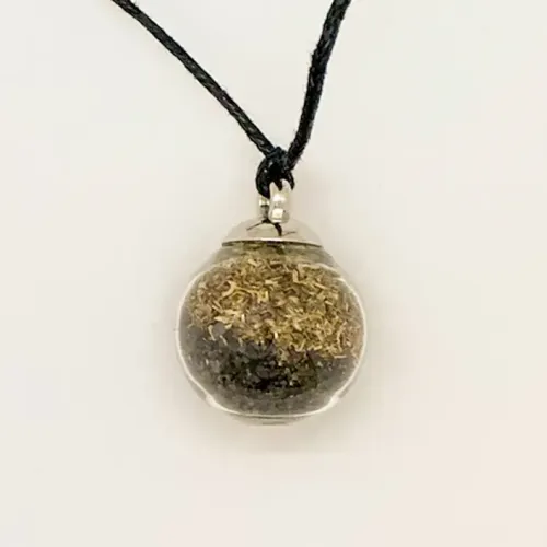 Кулон-оберег из натуральных материалов: чабреца, черной соли, стекла и хлопковой нити.