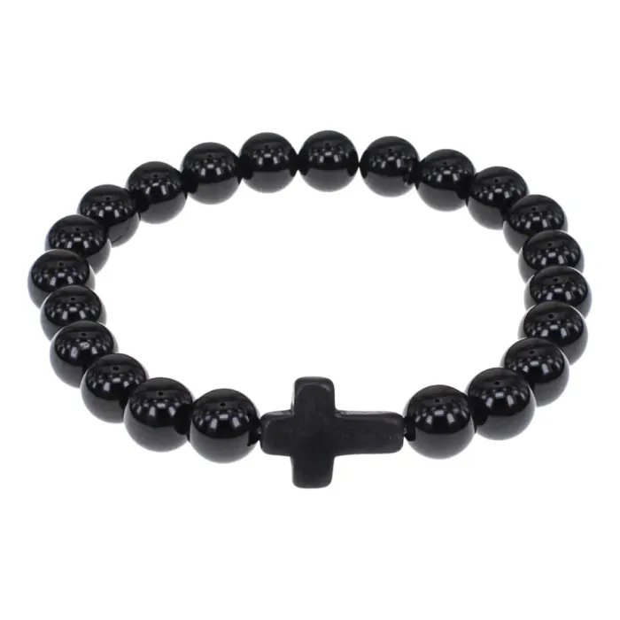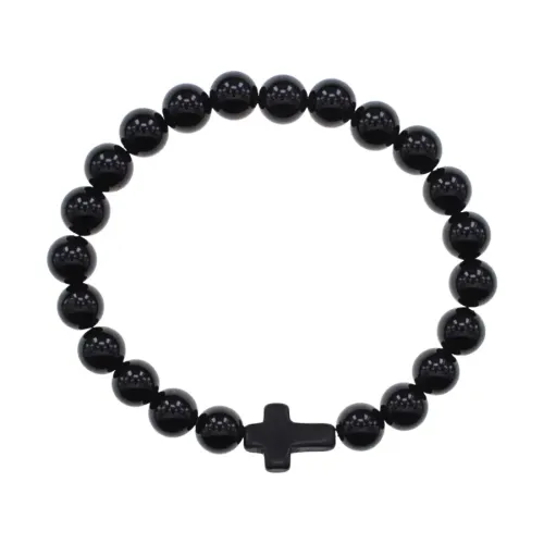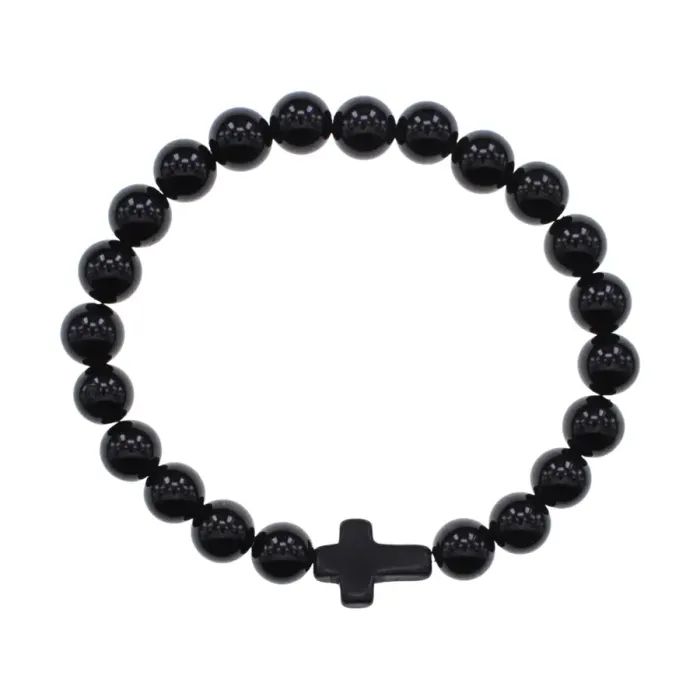 Христианский браслет Крест с нат.камнем Черный агат 8мм BSHE-12-23