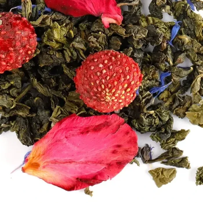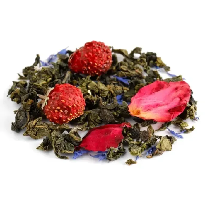 Состав: китайский улун, ягоды клубники, лепестки розы, лепестки василька, ароматизаторы (клубника, тропические фрукты)