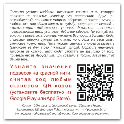 Размеры и комплектация: Упаковка — прозрачный пакетик с подвесом. На упаковке размещён QR-код с информацией.