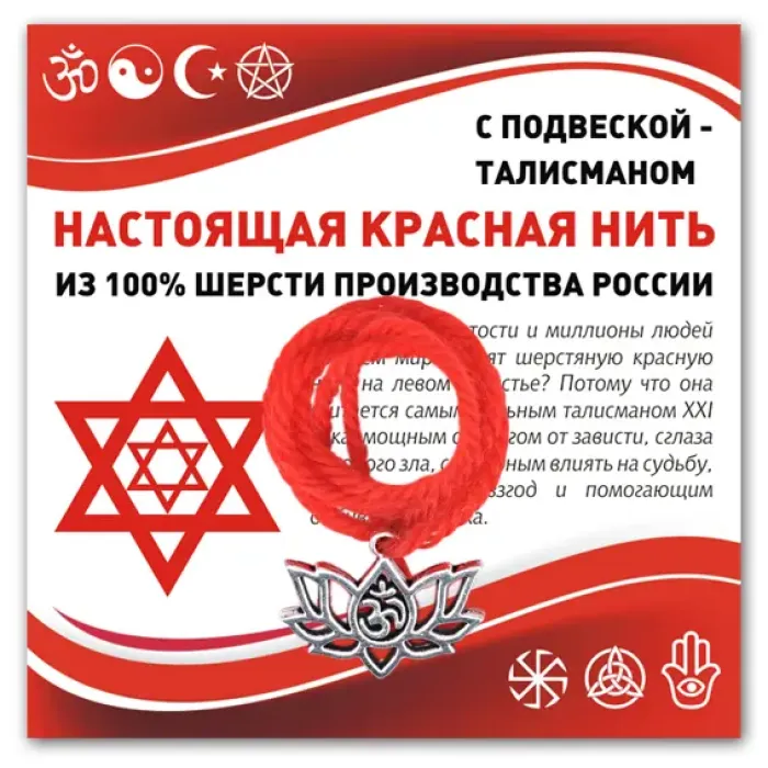 Красная нить Ом и лотос — это уникальный талисман, символизирующий защиту, гармонию и развитие. Изготовленная из 100% шерсти с металлической подвеской, эта нить сочетает в себе традиции и современность. На обратной стороне подложки размещен QR-код, который открывает доступ к описанию значений подвесок и красной нити. Упаковка выполнена в прозрачном пакетике с удобным подвесом, что делает данный товар отличным вариантом для подарка или личного использования.