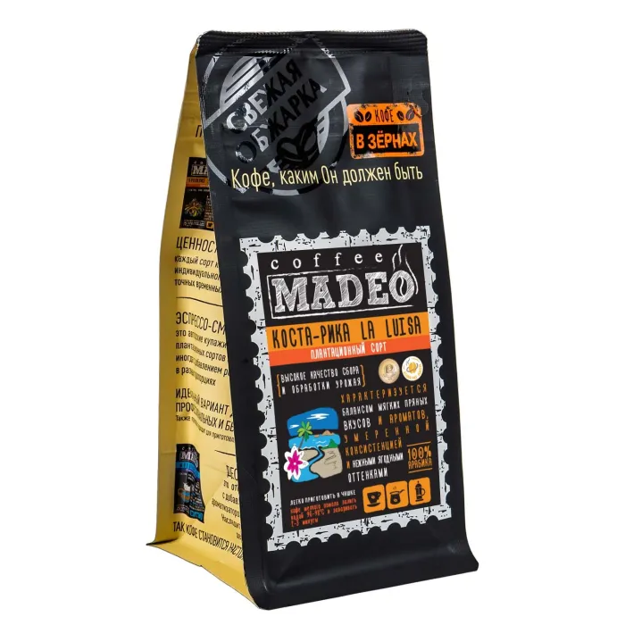 Плантационный кофе Madeo La Luisa — это арабика из региона Tres Milagros в Коста-Рике. Средняя обжарка раскрывает насыщенный вкус с нотами тёмного шоколада и пряностей, дополненными тонкими оттенками лесных ягод и красного вина.
