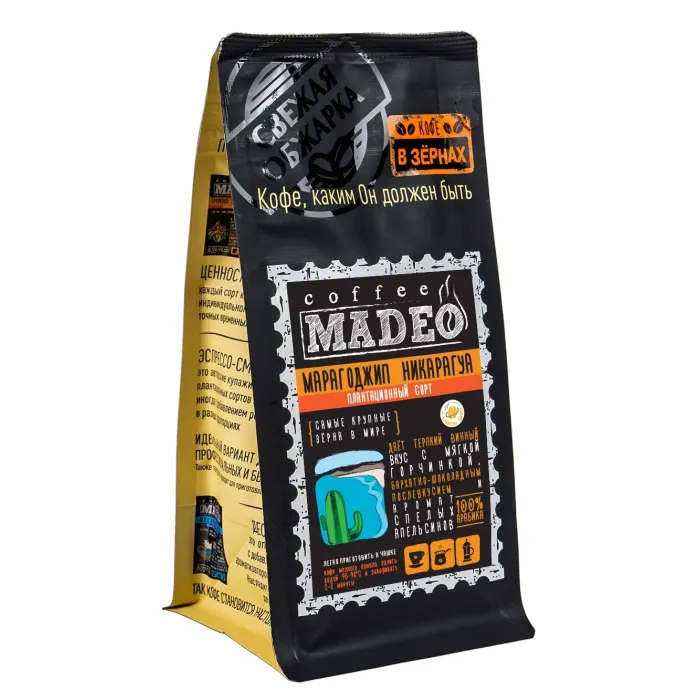 Плантационный кофе Madeo Марагоджип из Никарагуа — это уникальная разновидность арабики с очень крупными зёрнами. Средняя обжарка раскрывает сбалансированный профиль с нотами шоколада и лёгкой цитрусовой свежестью. Напиток отличается плотным телом, сбалансированной горчинкой и средней кислотностью.