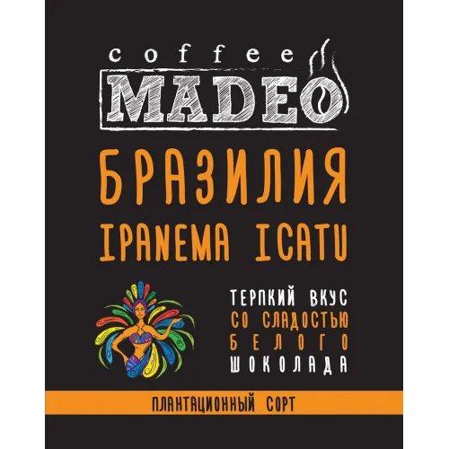 Плантационный кофе Madeo из Бразилии, выращенный на высоте 1300 метров в регионе Минас-Жерайс. Средняя обжарка раскрывает сбалансированный вкус с нотами белого шоколада и ореха, плотное тело и долгое послевкусие.