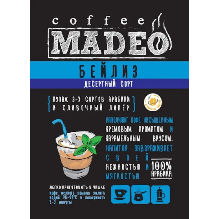 Десертный кофе Madeo Бейлиз — это зерновая арабика из стран Латинской Америки. Средняя обжарка раскрывает мягкий карамельный вкус с узнаваемыми нотами молочного ликёра, создавая ощущение нежного сливочного лакомства. Напиток обладает низкой кислотностью, плотным телом и сбалансированной горчинкой.