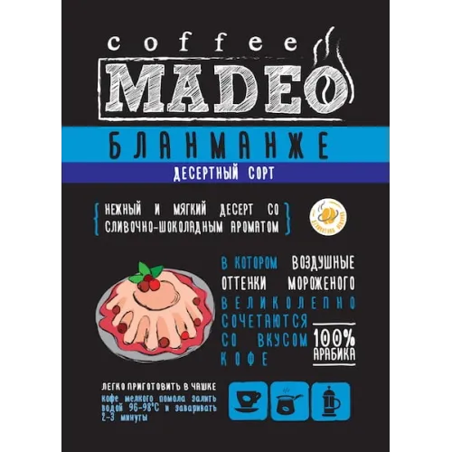 Кофе в зернах Madeo Бланманже — уникальный десертный купаж с добавлением кондитерского сиропа, который создаёт мягкий сливочно-шоколадный аромат. В основе — отборная арабика из стран Латинской Америки, обжаренная до средней степени, что подчеркивает плотное тело и низкую кислотность. Вкус напоминает нежный молочный десерт с умеренной горчинкой и долгим послевкусием.