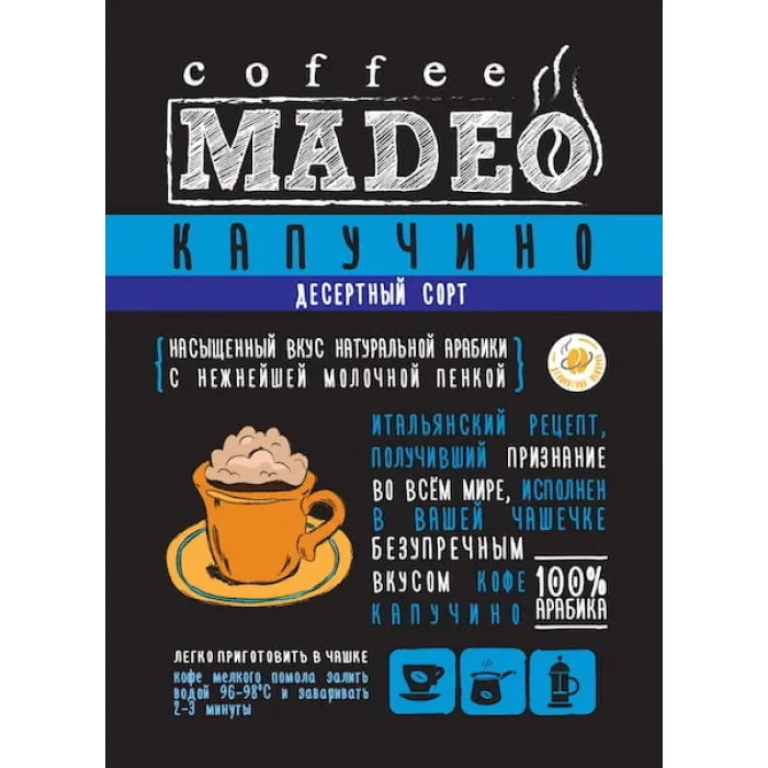 Десертный кофе Madeo «Капучино» молотый создан для любителей мягких и нежных вкусов. В основе — 100% арабика из стран Латинской Америки, обжаренная до средней степени, что раскрывает молочные и карамельные оттенки. Напиток отличается низкой кислотностью, плотным телом и умеренной горечью.