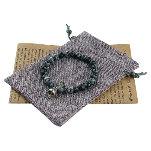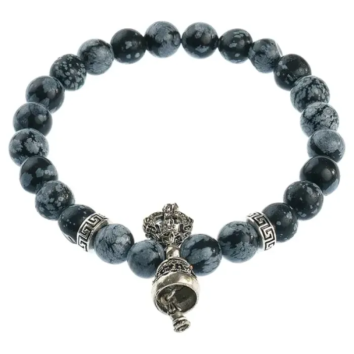 Стрейч-браслет из натурального обсидиана с амулетом в виде ваджры и колокольчика.