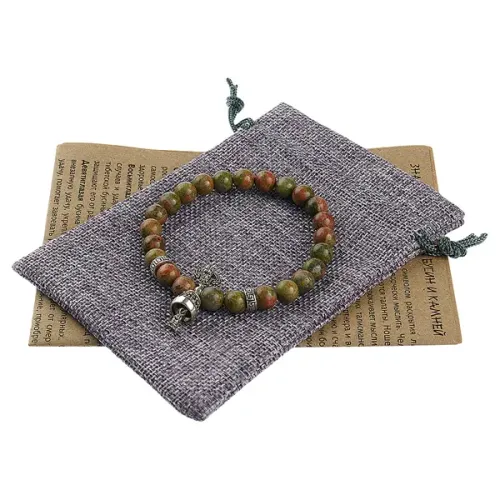 Материал и изготовление: Натуральный камень унакит, металлический амулет.
