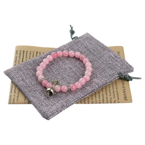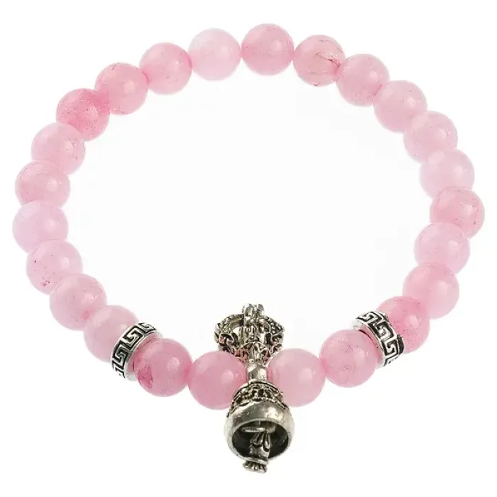 Стрейч-браслет из натурального розового кварца с амулетом в виде ваджры и колокольчика.