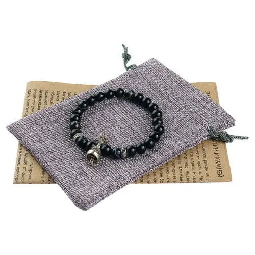 Стрейч-браслет из натурального чёрного агата с амулетом в виде ваджры и колоколом.