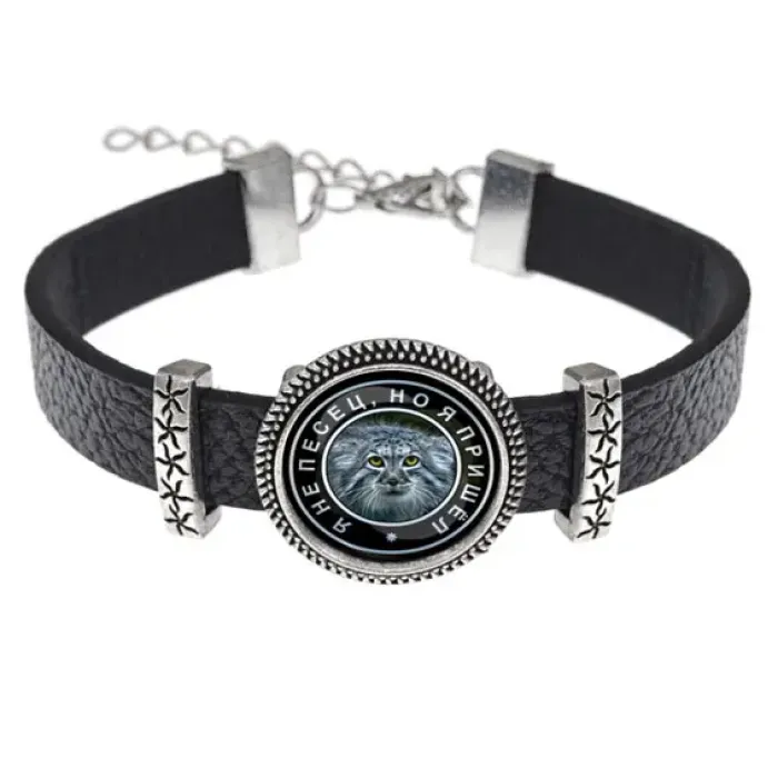 Кожаный браслет с металлической вставкой. Изображение диаметром 18 мм расположено под выпуклой стеклянной линзой.
