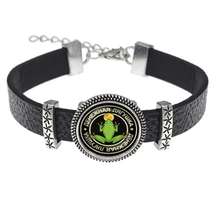 Кожаный браслет с изображением денежной лягушки. Изготовлен из кожи, металла и стекла, имеет регулируемый размер.