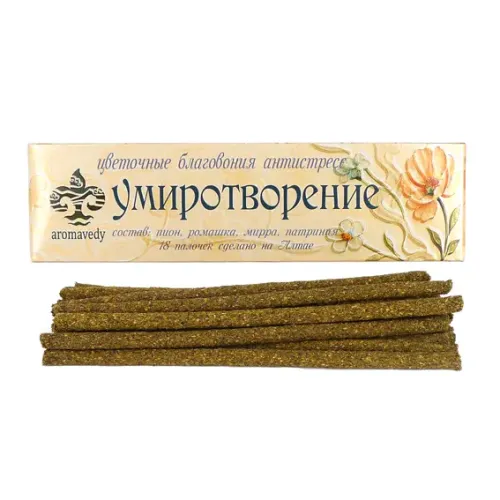 Благовония натуральные "Умиротворение" создают атмосферу спокойствия и гармонии. Эти ароматические палочки с нежным и успокаивающим запахом идеально подходят для медитации, релаксации или создания уюта в доме. В упаковке содержится 18 палочек, каждая из которых наполняет пространство мягким ароматом. Традиционно используются для очищения воздуха и создания приятной обстановки. Отличный выбор в качестве небольшого подарка или для личного наслаждения.