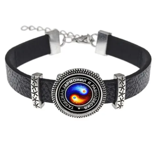 Кожаный браслет с символикой Инь-Ян. Изображение защищено выпуклой стеклянной линзой, размер регулируется.
