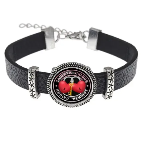Кожаный браслет «Защита любви» — это стильный и символичный аксессуар, который станет прекрасным дополнением к любому образу. Он выполнен из качественной кожи, металла и стекла, что обеспечивает долговечность и элегантный внешний вид. Браслет украшен изображением диаметром 18 мм под выпуклой стеклянной линзой, что придаёт ему особую привлекательность.