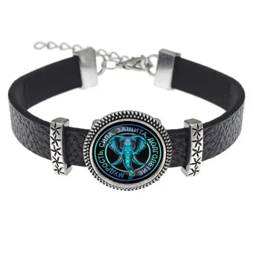 Кожаный браслет с декоративным элементом в виде слона под защитной линзой.