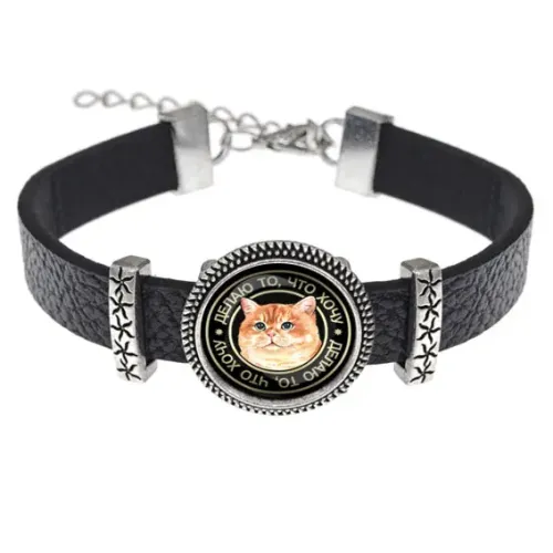 Кожаный браслет с декоративным элементом в виде изображения кота под стеклянной линзой.