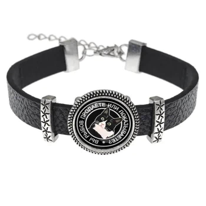 Кожаный браслет с декоративным элементом под стеклянной линзой.