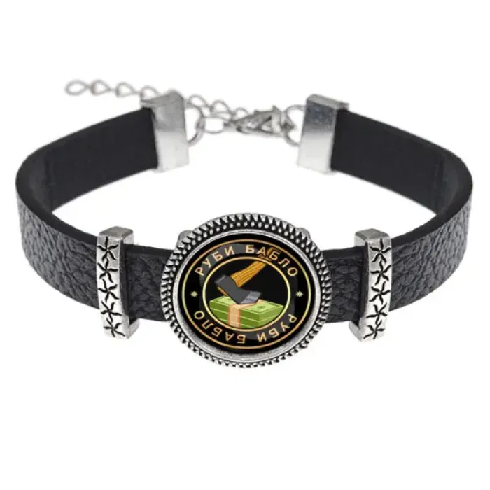 Кожаный браслет с декоративным элементом под стеклянной линзой.