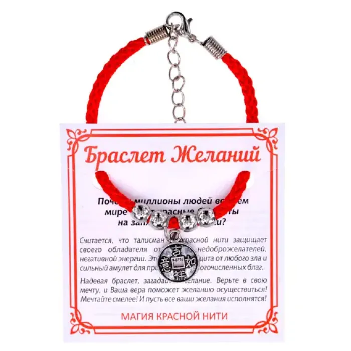 Браслет Желаний — это уникальный аксессуар, который сочетает в себе красоту и символику. Красный шнурок олицетворяет удачу и защиту, а подвеска-талисман в форме китайской монетки символизирует богатство и процветание. Этот браслет станет отличным подарком для тех, кто стремится привлечь финансовое благополучие в свою жизнь. Упакован в прозрачный полипропиленовый пакет с подвесом, что делает его идеальным вариантом для презента.