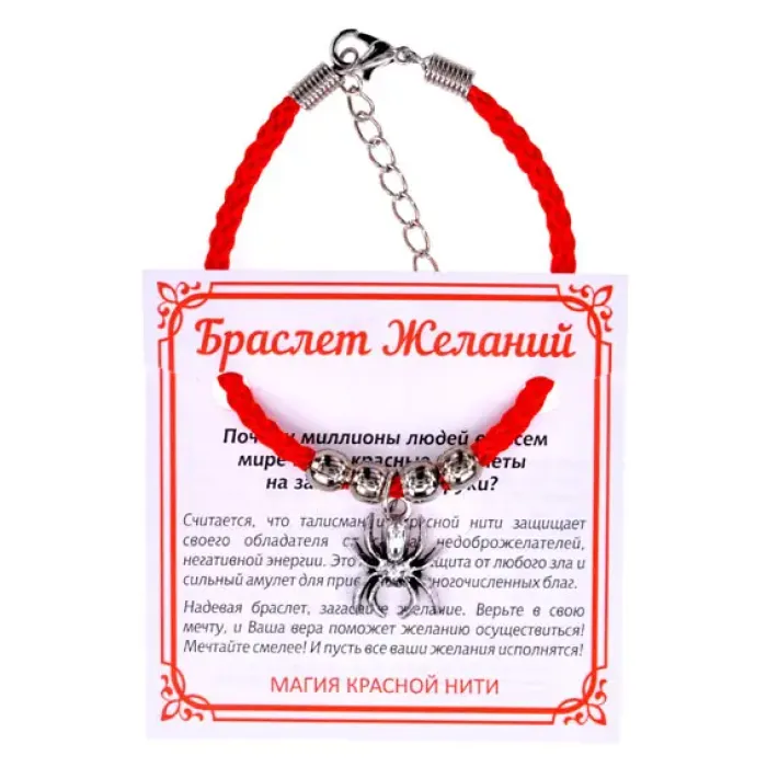 Браслет-оберег из красного шнурка с металлической подвеской в виде паука.
