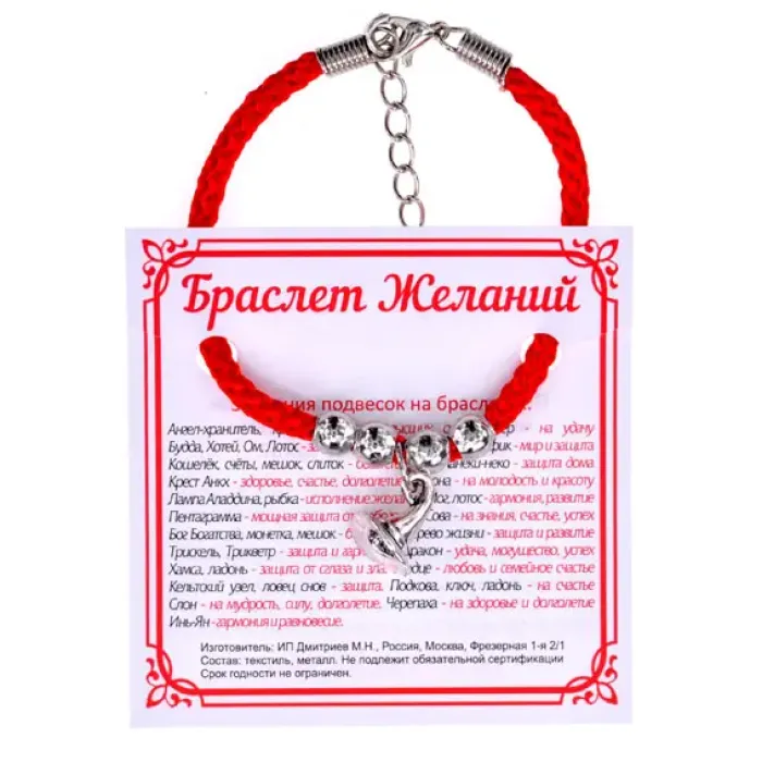 Браслет желаний — это уникальный аксессуар, который сочетает в себе магию и символику. Красный шнурок олицетворяет силу и энергию, а подвеска-талисман в форме шляпы добавляет изюминку и служит напоминанием о заветных мечтах. Этот браслет традиционно используется как оберег, который помогает привлекать удачу и исполнять желания. Упакован в прозрачный полипропиленовый пакет с подвесом, что делает его отличным вариантом для подарка или сувенира. Браслет станет не только стильным дополнением к образу, но и символом надежды на лучшее.