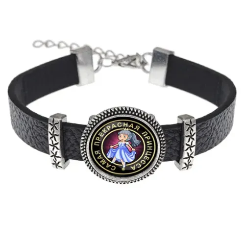 Кожаный браслет "Самая прекрасная принцесса" — это стильный аксессуар, который подчеркнёт индивидуальность и добавит изюминку в любой образ. Изображение диаметром 18 мм защищено выпуклой стеклянной линзой, что придаёт ему особую выразительность.