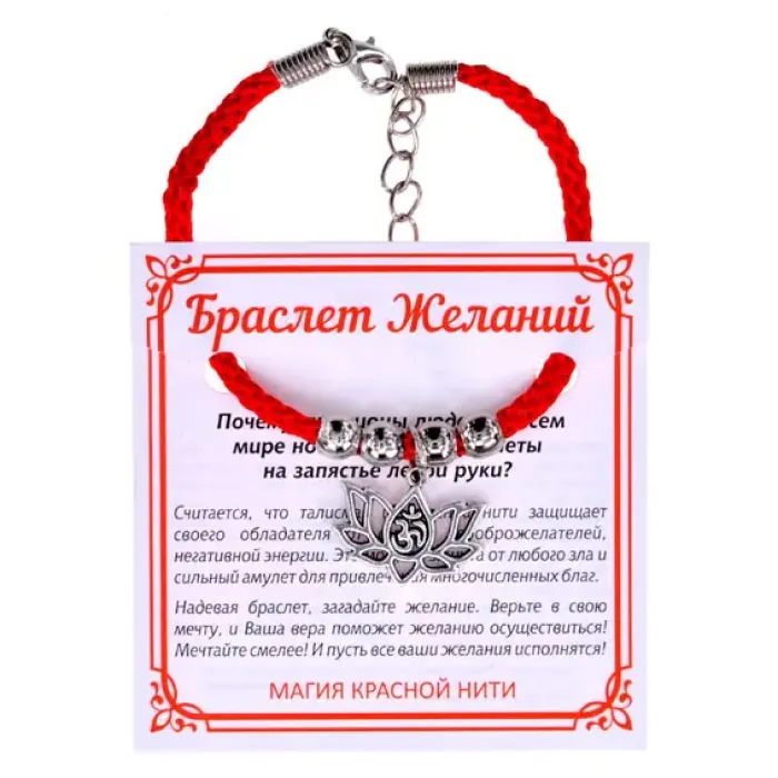 Браслет-сувенир на красном шнурке с металлической подвеской в виде символов Ом и лотоса.