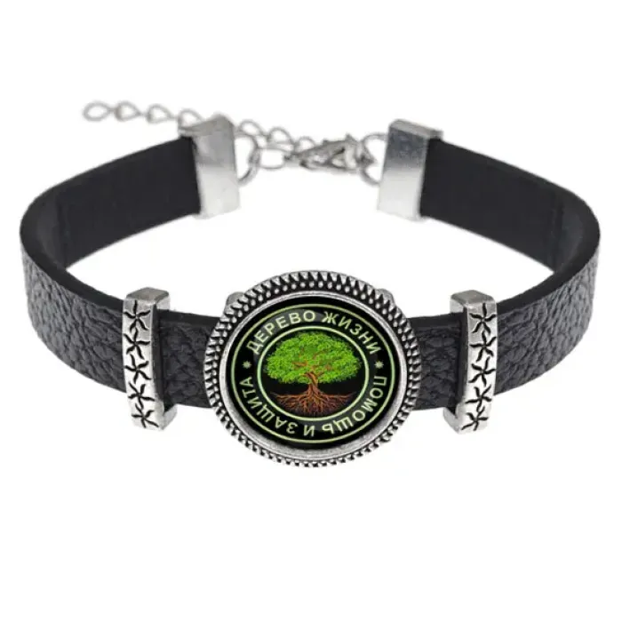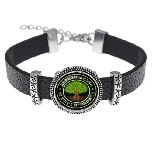 Кожаный браслет с декоративным элементом «Дерево жизни». Изображение защищено выпуклой стеклянной линзой.
