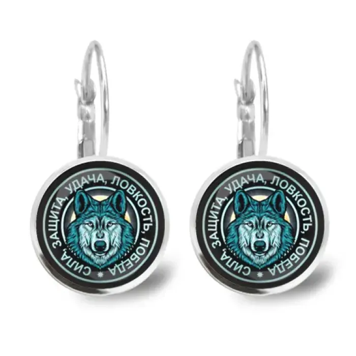 Серьги из бижутерного сплава с выпуклыми стеклянными линзами и изображением волка.