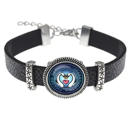 Кожаный браслет с изысканным изображением двух лебедей, заключённым под выпуклой стеклянной линзой, станет стильным аксессуаром для любого образа. Этот регулируемый браслет подходит на любую руку и выполнен из качественных материалов: кожи, металла и стекла.