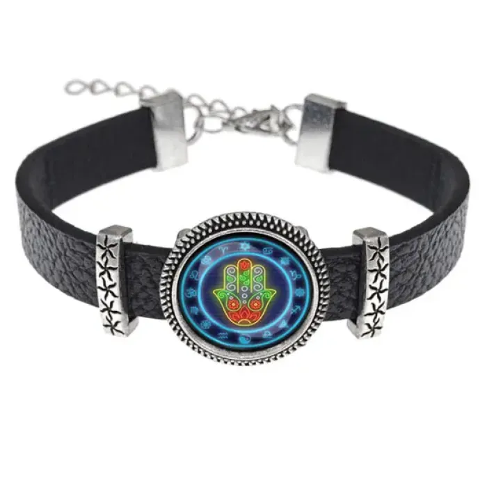 Кожаный браслет с металлической вставкой в виде символа Хамса. Изображение диаметром 18 мм расположено под выпуклой стеклянной линзой.