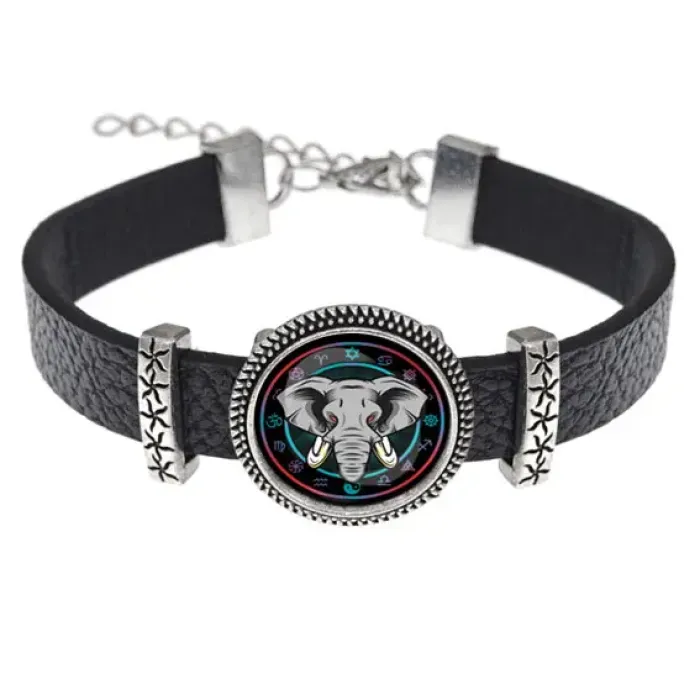 Кожаный браслет с декоративным элементом в виде слона. Изображение расположено под выпуклой стеклянной линзой, размер регулируется.
