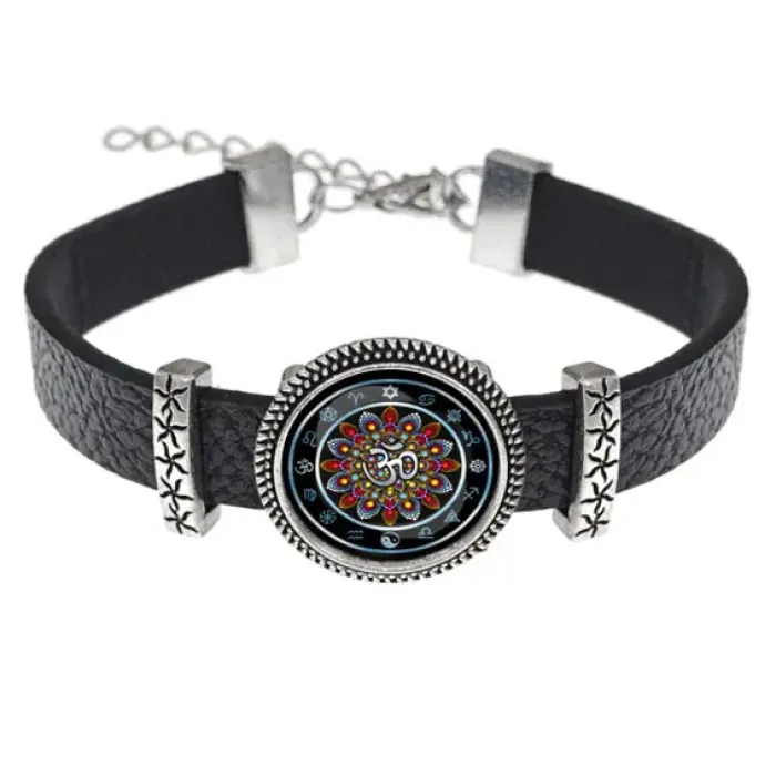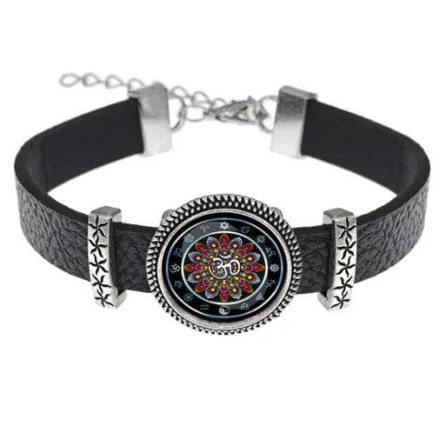 Кожаный браслет с изображением мандалы Ом. Изображение диаметром 18 мм расположено под выпуклой стеклянной линзой.