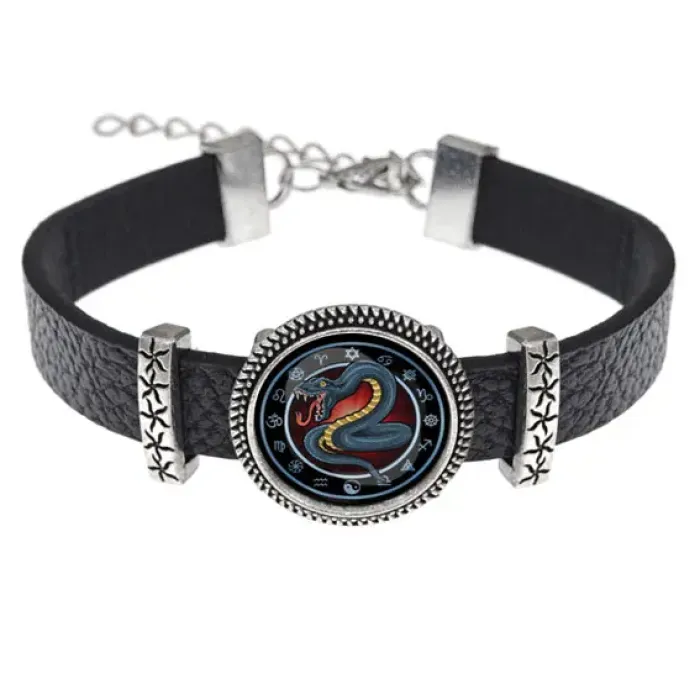 Кожаный браслет с декоративным элементом в виде змеи. Изображение защищено выпуклой стеклянной линзой, размер регулируется.