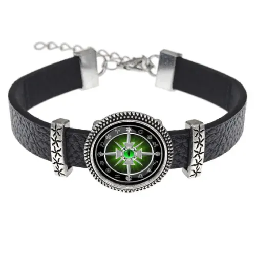 Кожаный браслет с металлической подвеской в виде креста с глазом и клинками. Основное украшение — изображение диаметром 18 мм под выпуклой стеклянной линзой.
